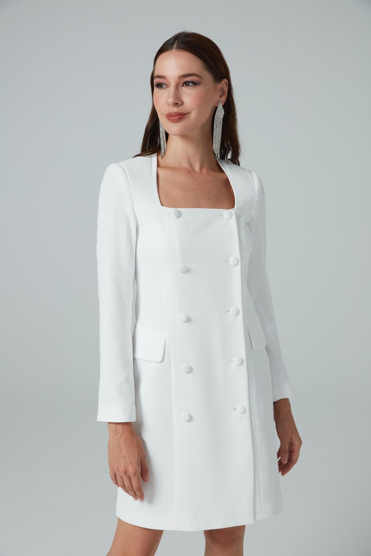 Beyaz, diz üstü boy, kare yaka, düğmeli ceket elbise