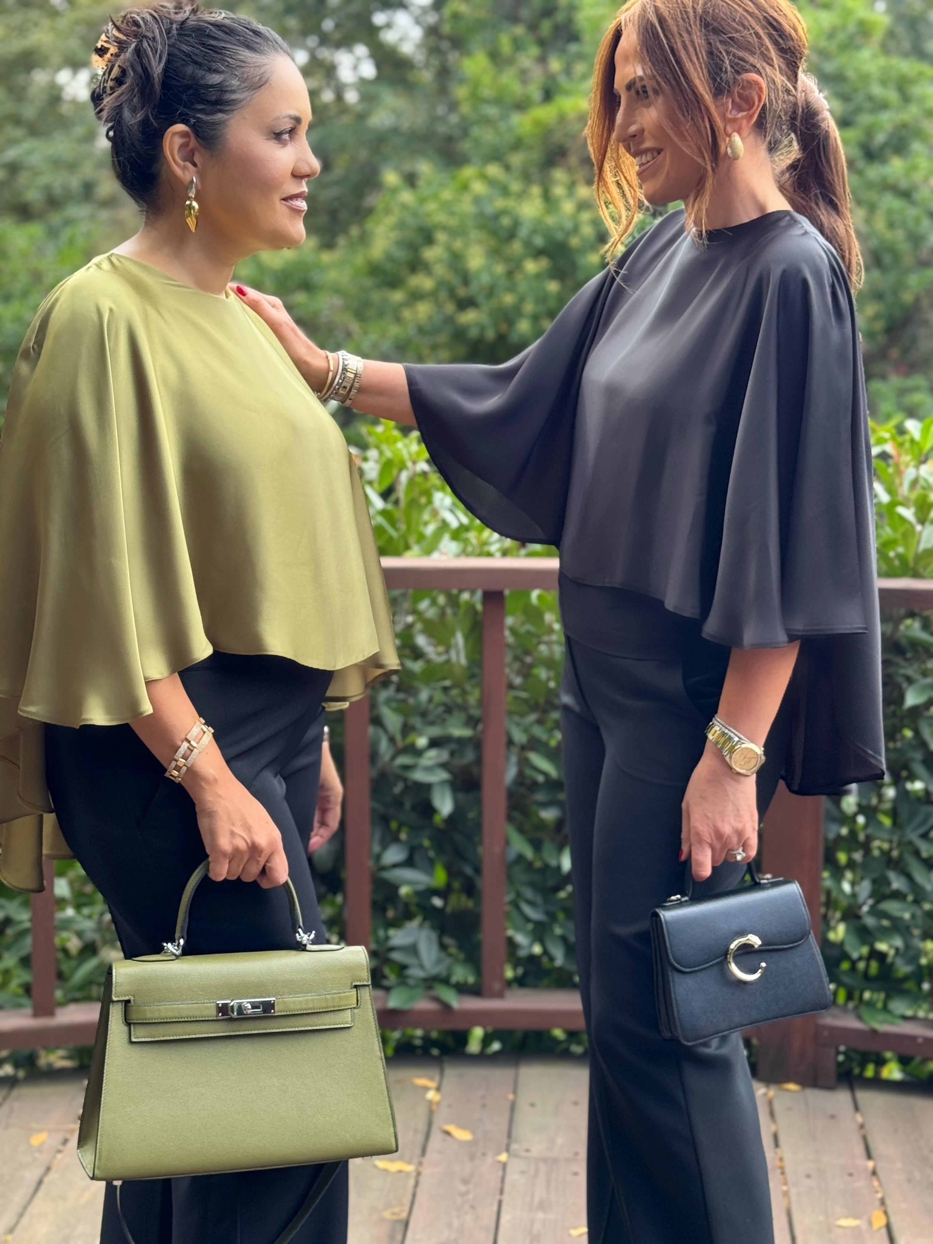 İpek saten pelerin detaylı, iç kısmı esnek jarse kumaş, abiye bluz. Tam beden.