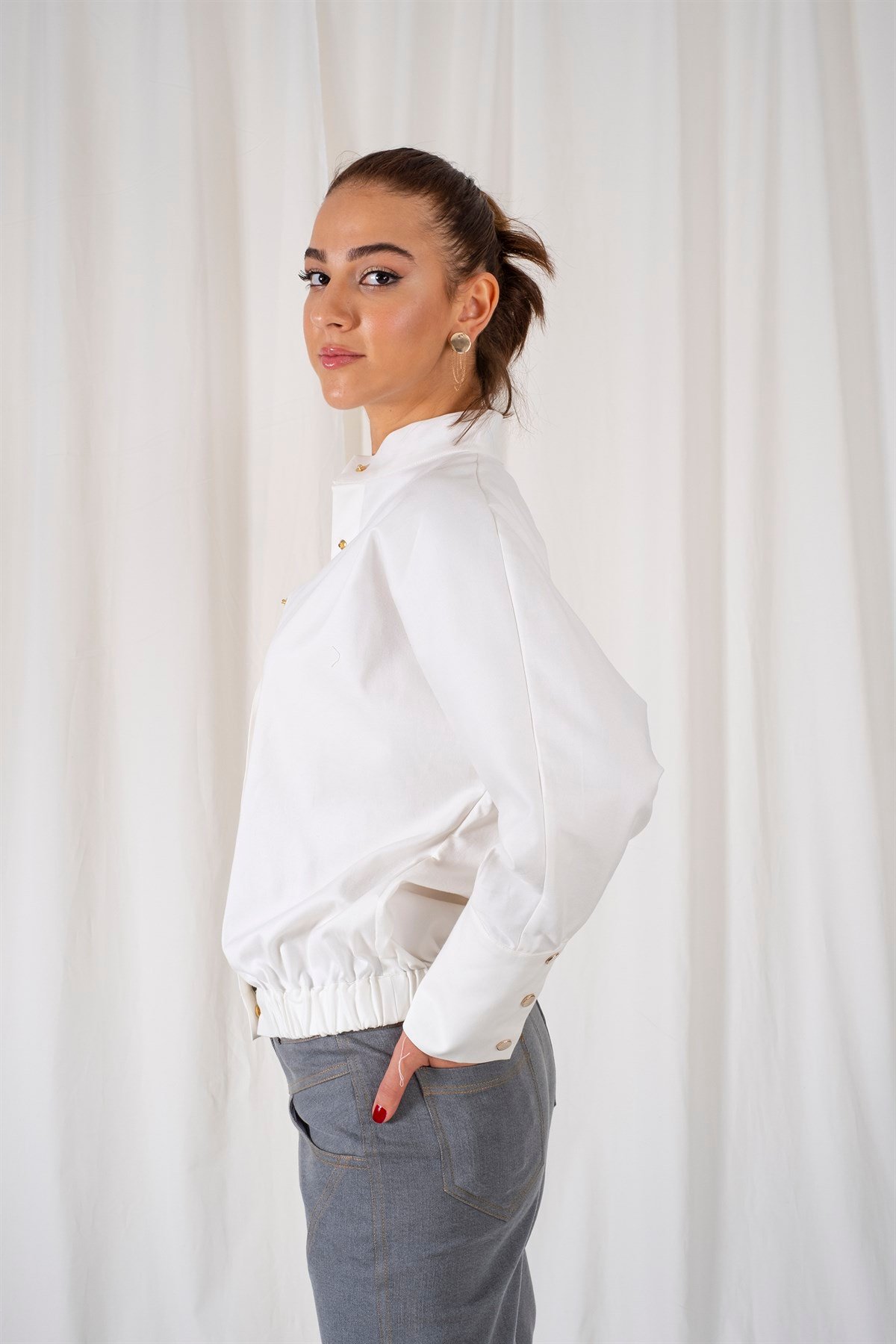 White koton shirt with snap fastener and with rubber on the waist and cuff.