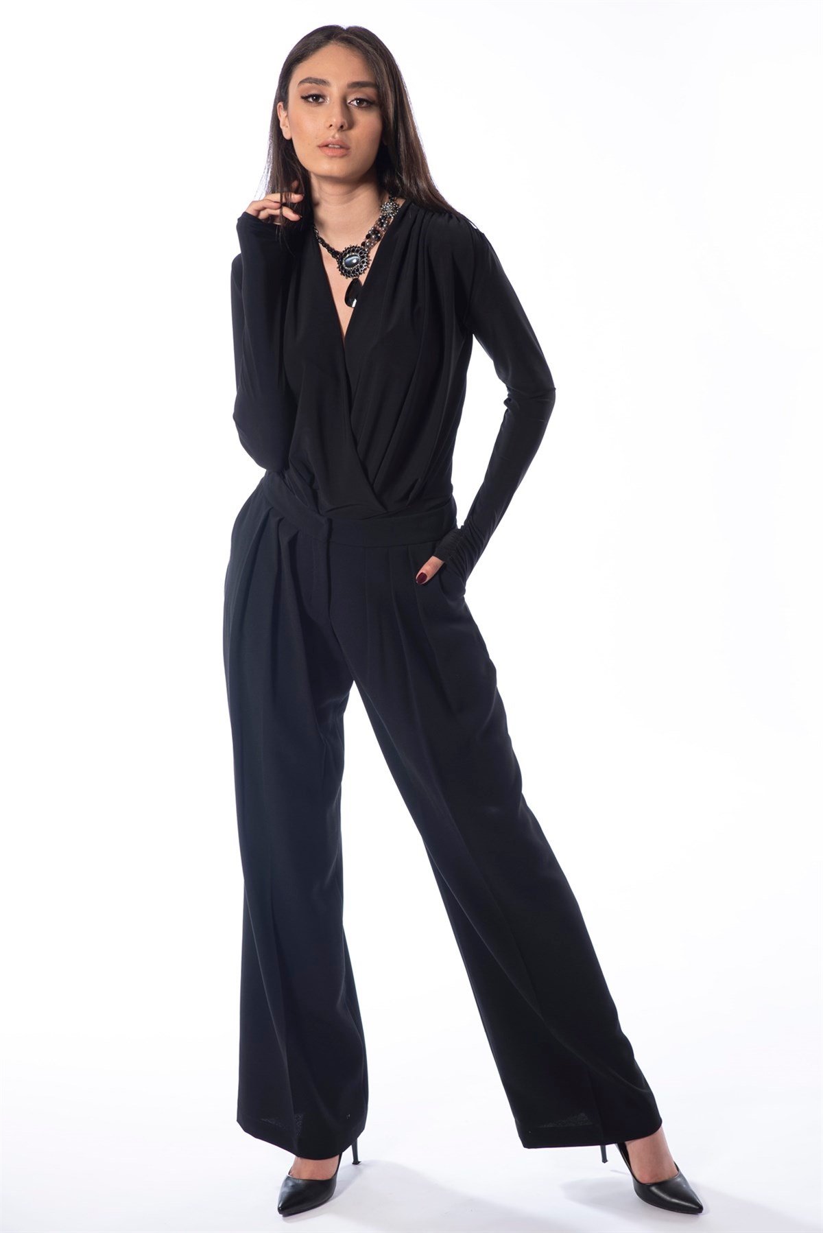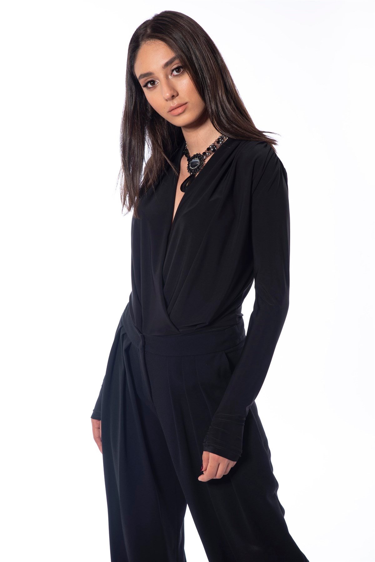 Wrap front, V-neck, shirred shoulders, long sleeve jersey blouse with elasticated waistband. Regular fit. True to size.
