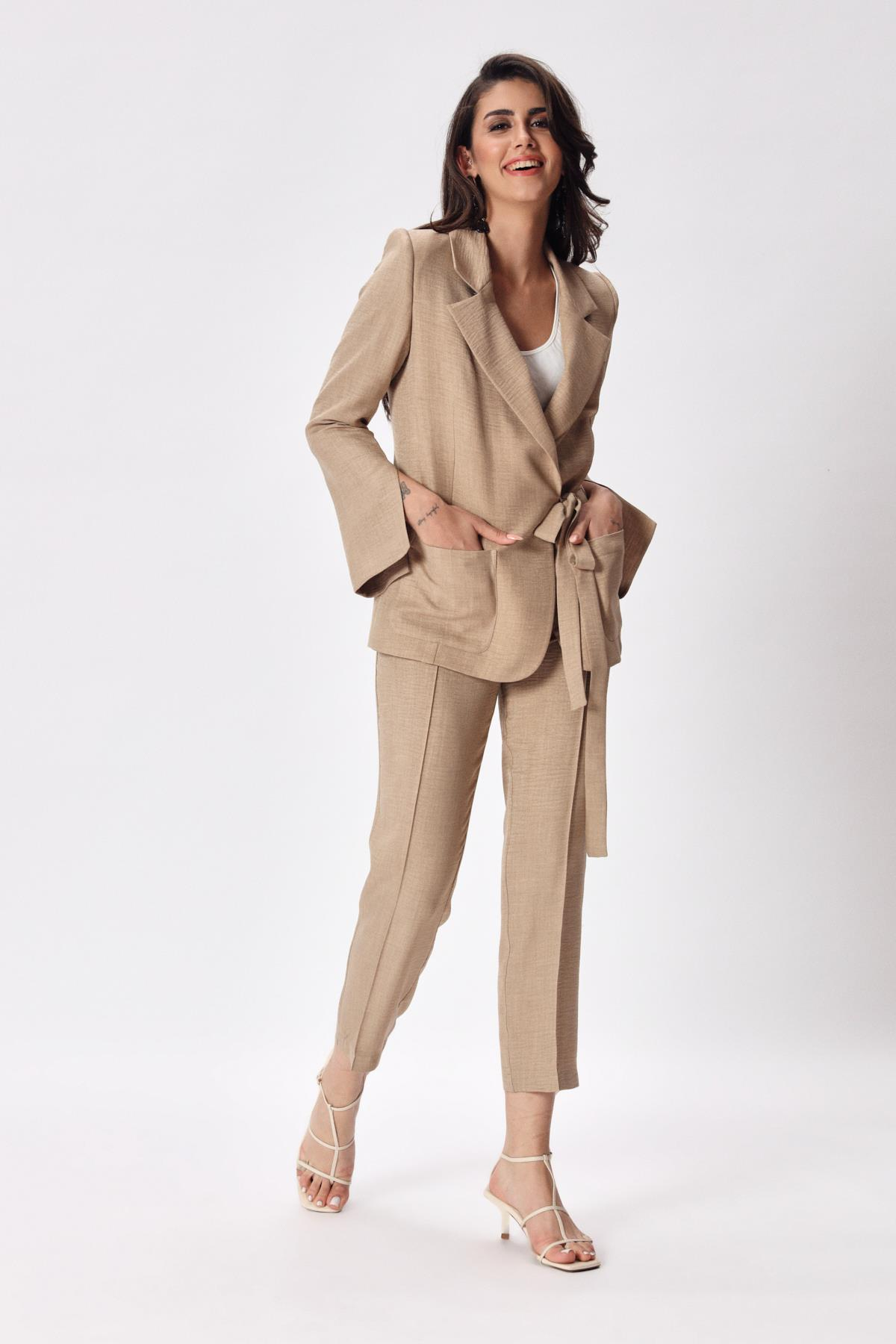 Kruvaze kesim, kuşak bağlama detaylı, keten ceket