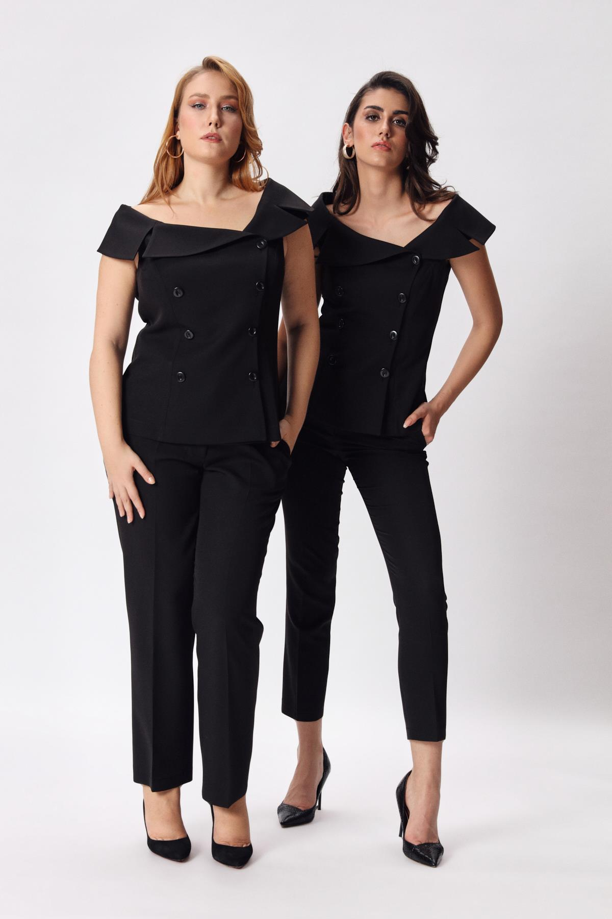 Omuzları açık, kolsuz, düğmeli siyah ceket