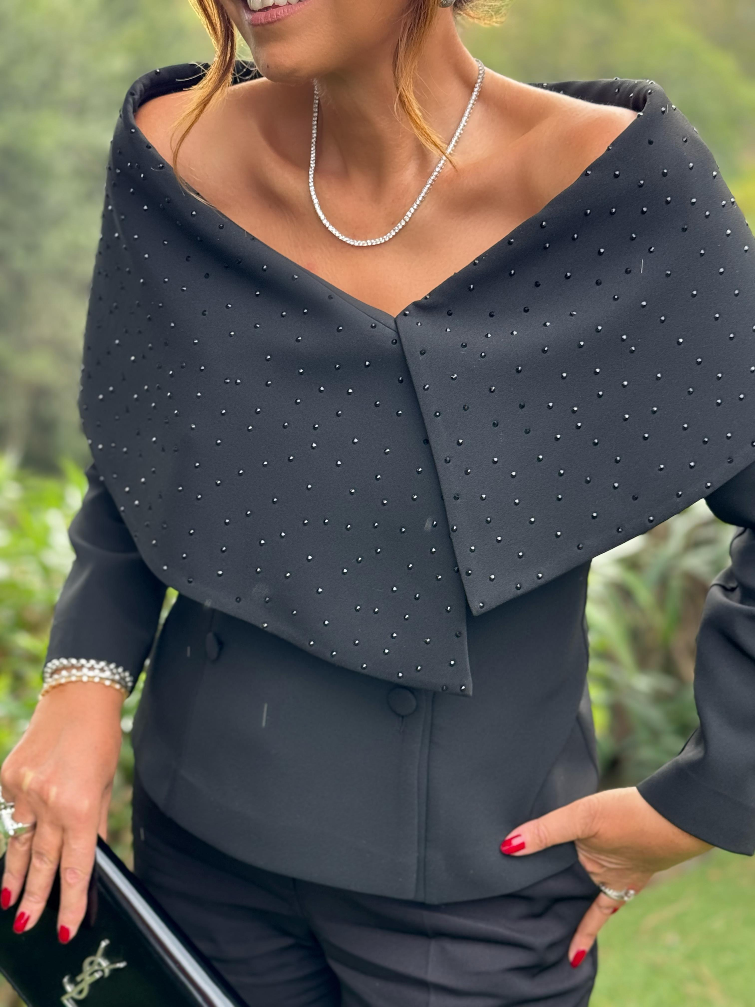 Omuzları açık, kolsuz ve geniş yakalı, düğmeli siyah ceket