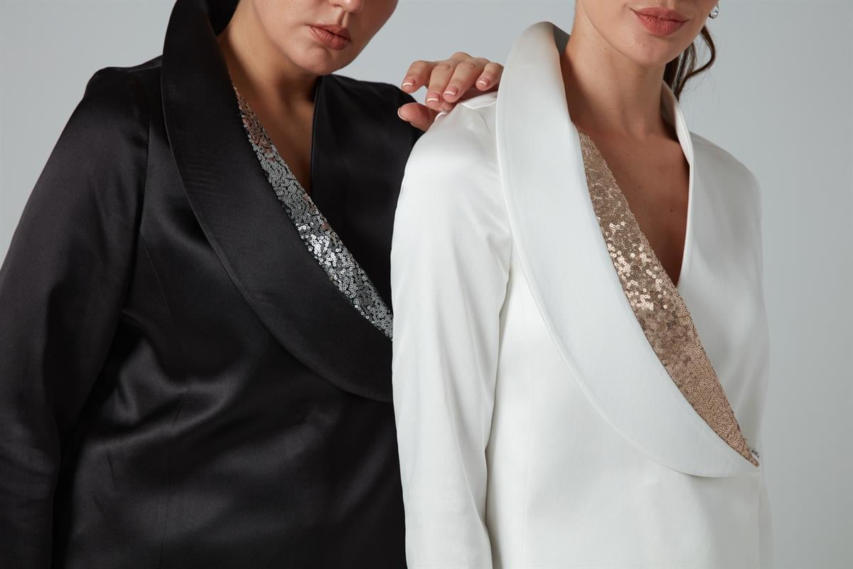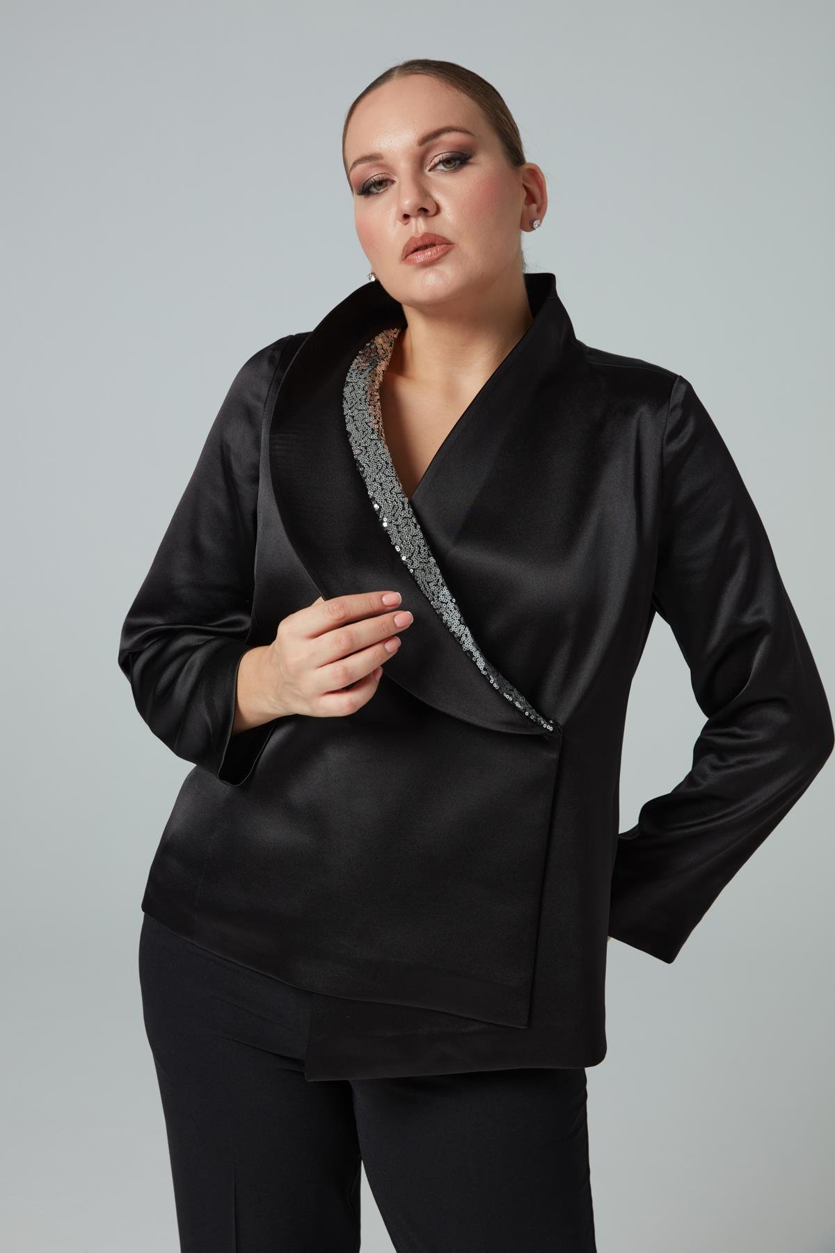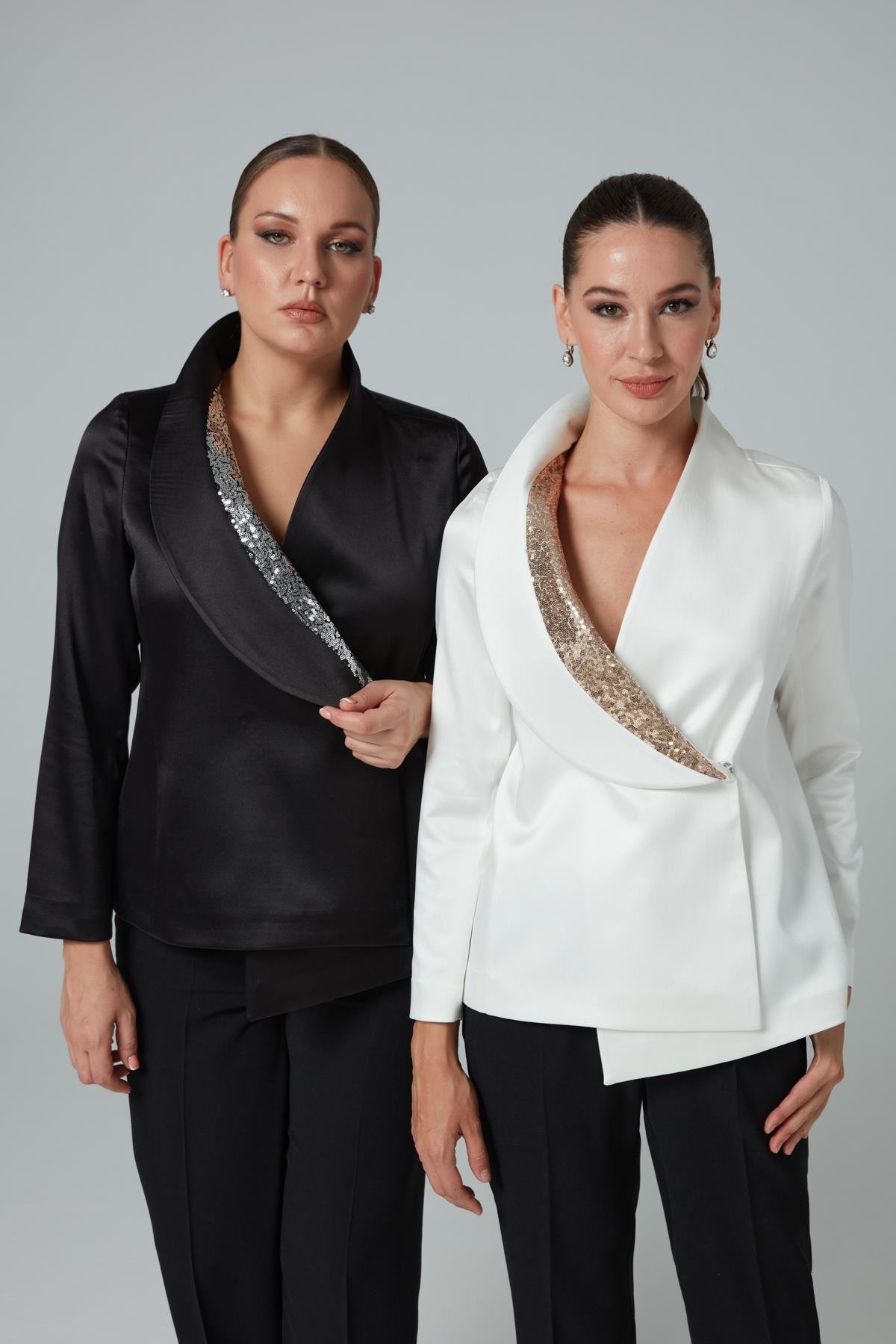 Payetli asimetrik kesim tasarım yaka detaylı, saten ceket