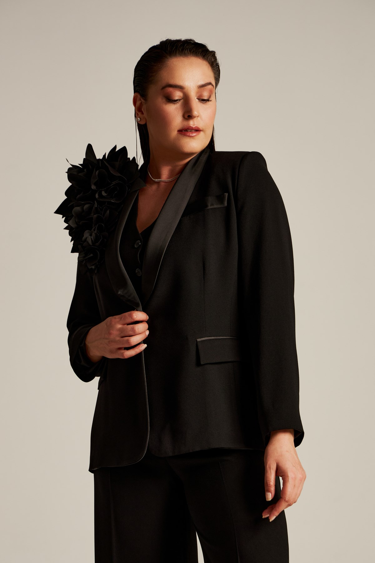 Saten şal yaka, tek düğmeli, smokin model, siyah krep ceket. Astarlı. Tam kalıp.